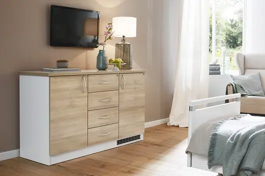 Nosso sistema de armários foi projetado para ser tão compacto e flexível que pode ser adaptado aos respectivos desejos de mobiliário e condições do recinto, com muitos opcionais. Ele cria um ambiente elegante e aconchegante que pode ser comparado a um bom hotel. Ao mesmo tempo, os móveis são práticos e seguros. Os ocupantes podem armazenar roupas e itens pessoais de maneira ideal e sempre ter acesso rápido. Quartos e salas de estar, recintos de trabalho ou refeitórios ganham um ambiente incomparável.