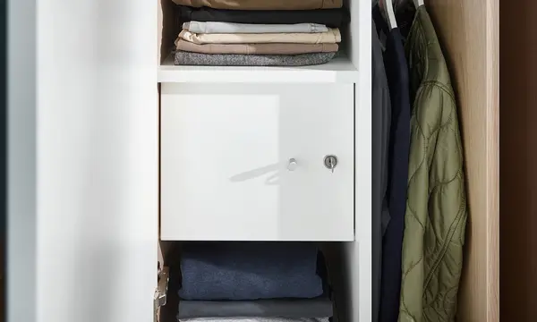 Durch einen Spiegel auf der Innenseite der Tür verwandelt sich der Schrank in ein kleines Ankleidezimmer.
