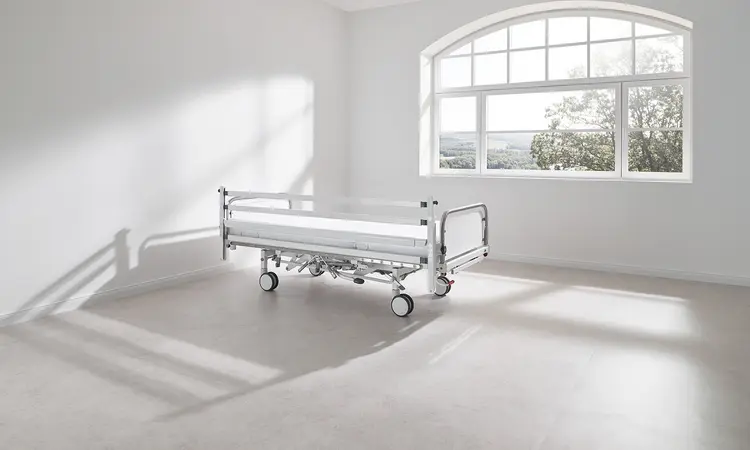 Our Deka hospital bed is particularly well suited for use in psychiatric care situations with special safety requirements. The three variants of the psychiatric bed described below are based on the experience of our customers and on practical requirements in closed psychiatric wards. In the interest of ensuring the highest possible level of safety, none of the versions have motorised adjustments. In addition, the mechanical adjustments can also be limited, if desired, or access to the operating levers of the gas springs and hydraulics can be made more difficult. The mattress base is made of welded-in steel wire mesh panels that are secured against removal. Additional special fixings also protect the bed against vandalism.