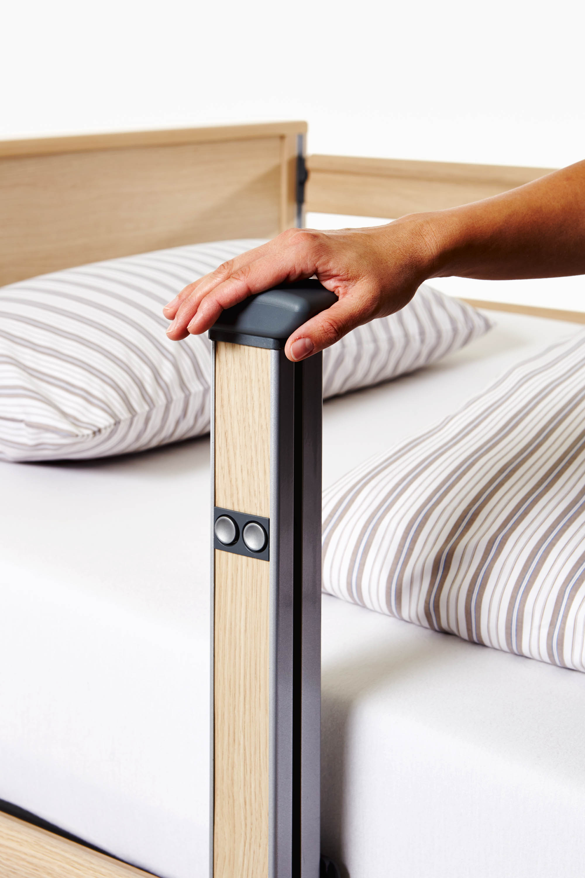 MOBILITY - The optional split safety side includes a middle post with an ergonomically shaped knob. Residents and patients can stand up unimpeded and support themselves.