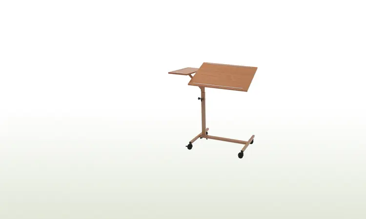 La mesita de cama y auxiliar Duo tiene una bandeja dividida en 2. La parte más pequeña permanece siempre en posición horizontal, mientras que la parte más grande puede bascularse horizontalmente.