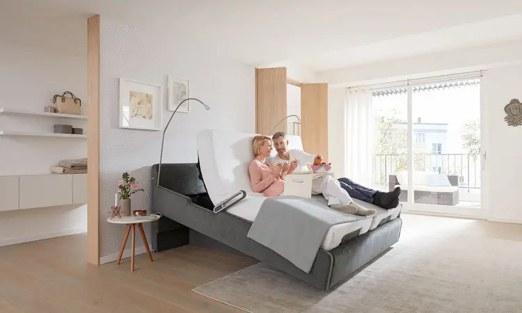 Las camas Lifestyle de Stiegelmeyer se convierten rápidamente en la pieza central de su hogar. Gracias a sus múltiples posibilidades de ajuste, son adecuados para leer, ver la televisión, comer e incluso para trabajar con una tableta. La función elevadora y las posiciones saludables de la base del colchón garantizan un sueño reparador y una entrada y salida cómodas.