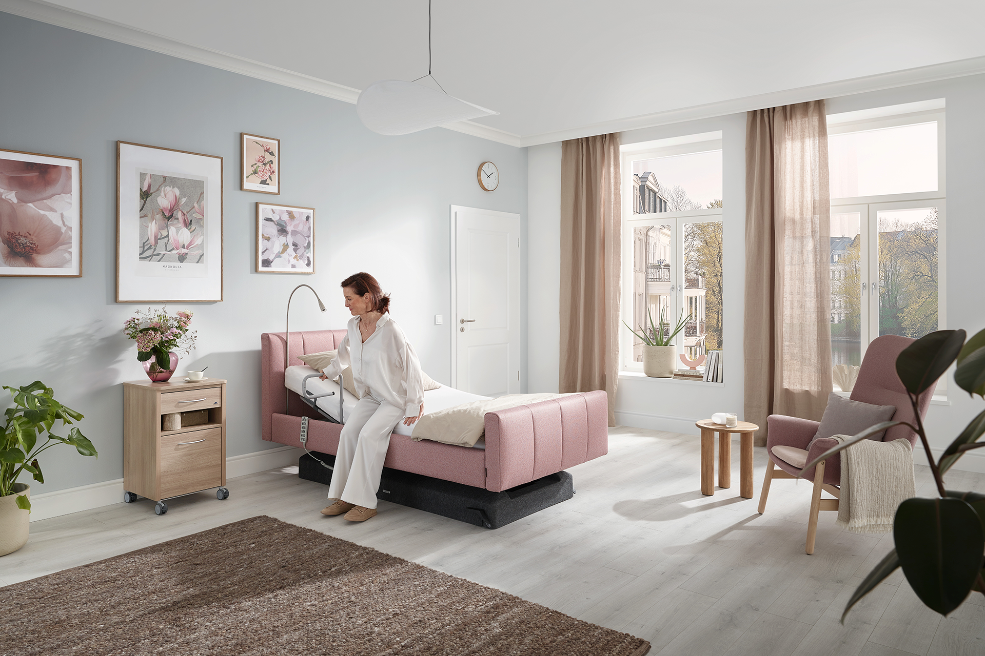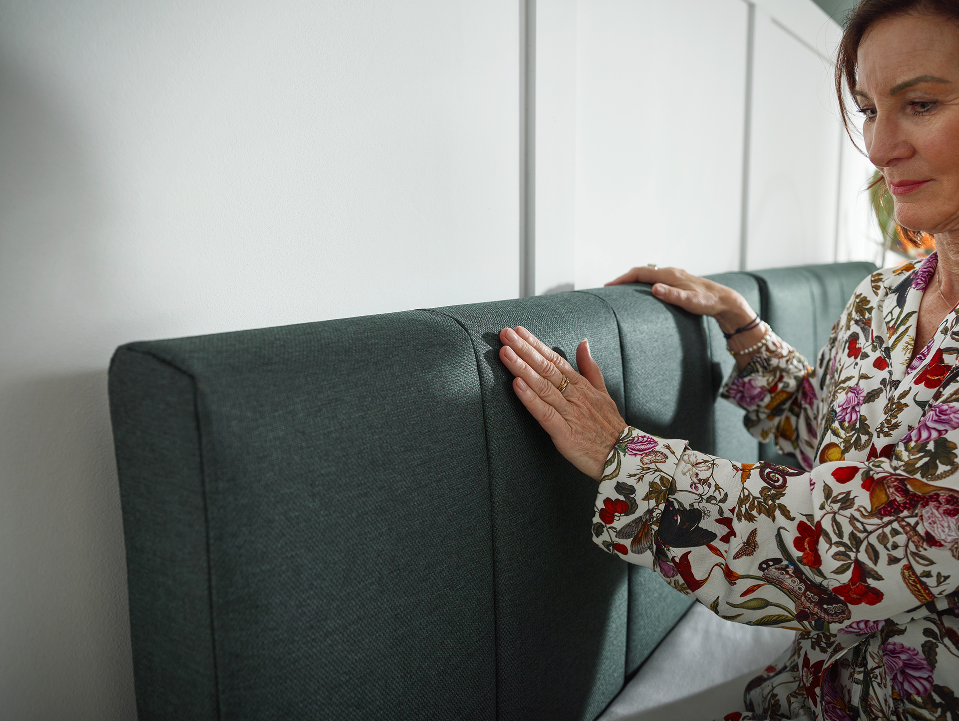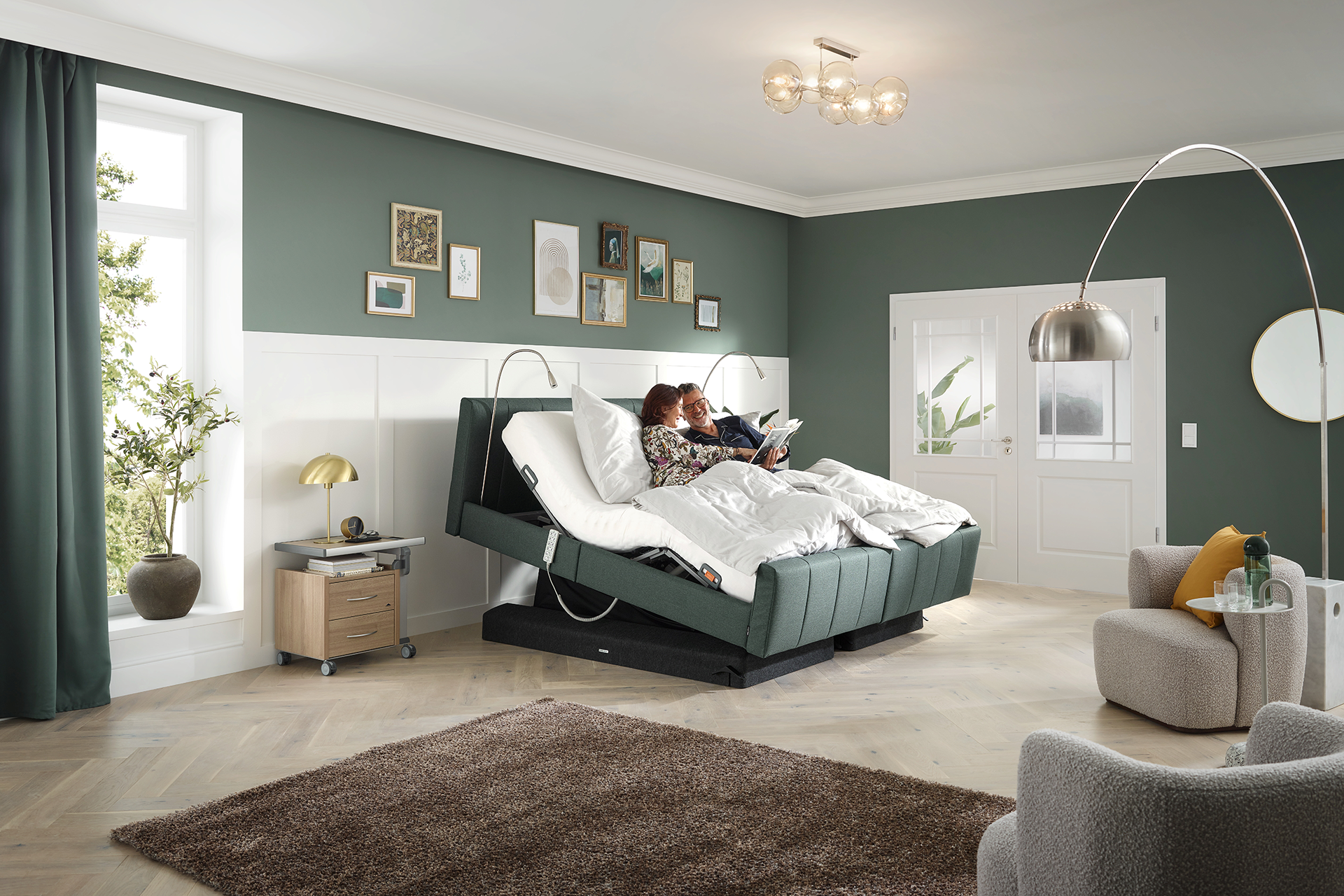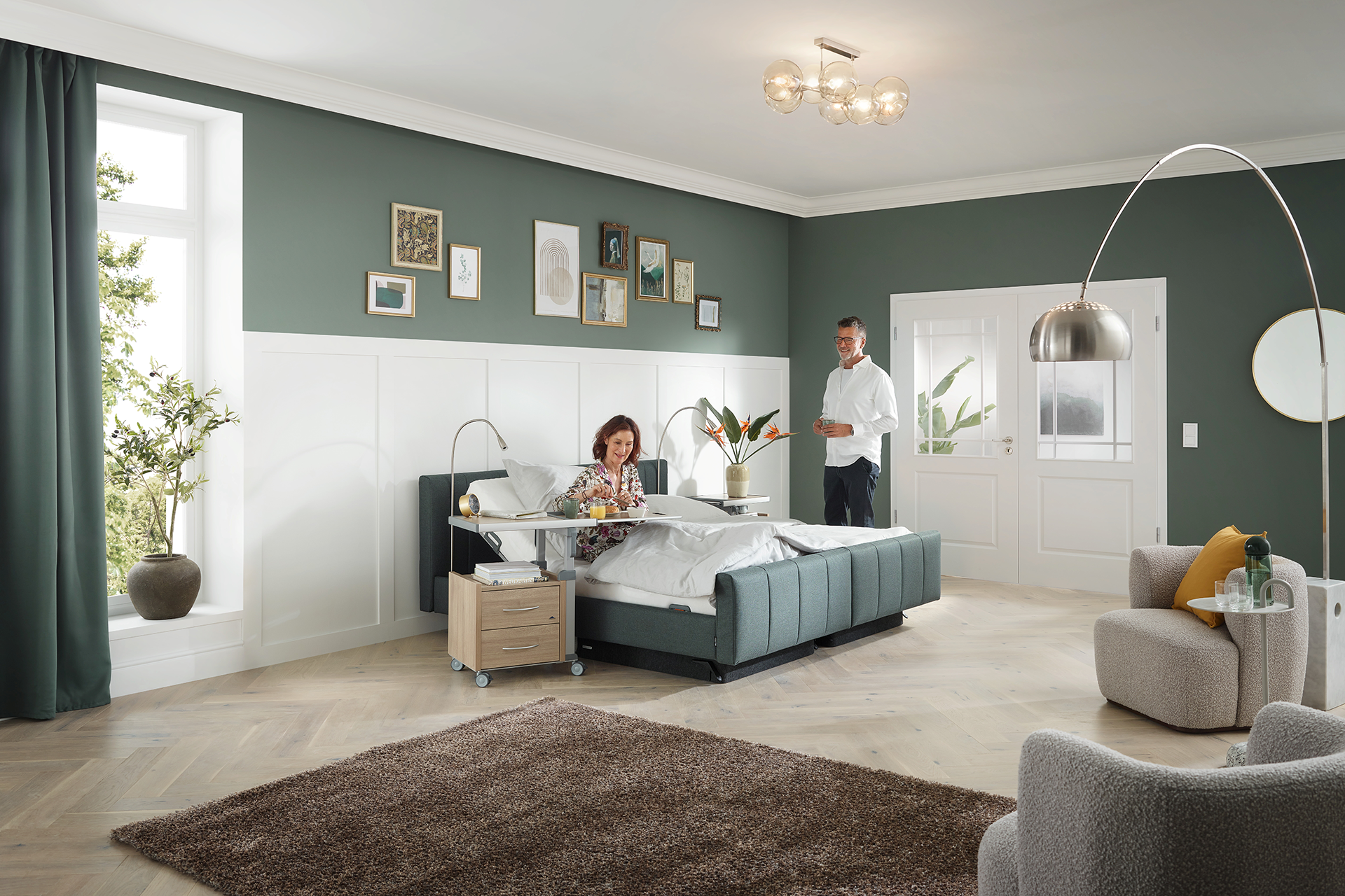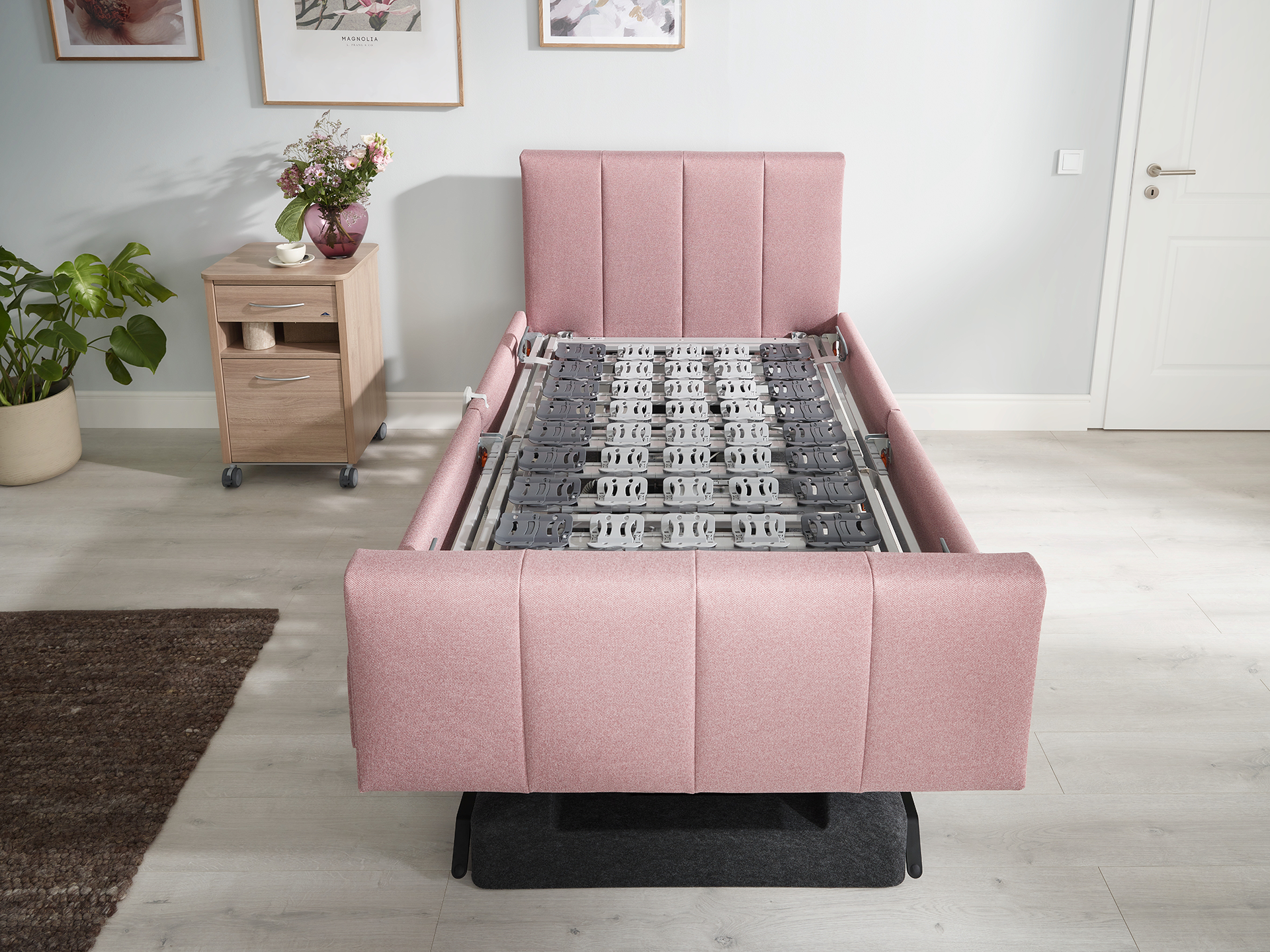 La cama encierra su tecnología moderna con un diseño que inspira a los usuarios. El acogedor cabecero acolchado y el estribo destacan de la misma manera que su maniobrabilidad sin esfuerzo gracias a las ruedas que permanecen ocultas bajo una base de cama de color antracita. Si lo desea, el chasis que está barnizado en negro puede incluso estar completamente encerrado en una funda de tela.