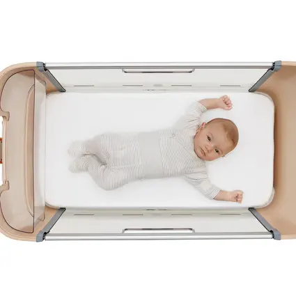 KÄYTÄNNÖLLISET VARUSTEET – Jovie-vauvasängyn vakiovarusteina on mukava patja ja irrotettava hoitovälinekori.