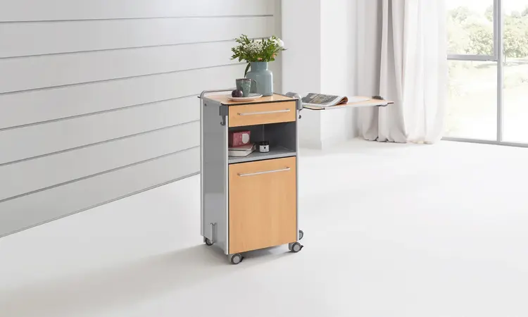 Le design rectiligne de la Somero est d'une élégance intemporelle et assure de bonnes propriétés hygiéniques. Avec des accessoires en option comme une tablette coulissante pour ordinateur portable ou un support à chaussons, la table de chevet garantit le confort d'un bon hôtel.
