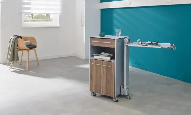 La Soreno eco, avec sa tablette de lit réglable en hauteur, est idéale pour les repas ou pour poser les ustensiles de soins. Avec son apparence rectiligne et les larges poignées étriers pratiques, elle s’intègre dans toutes les pièces.