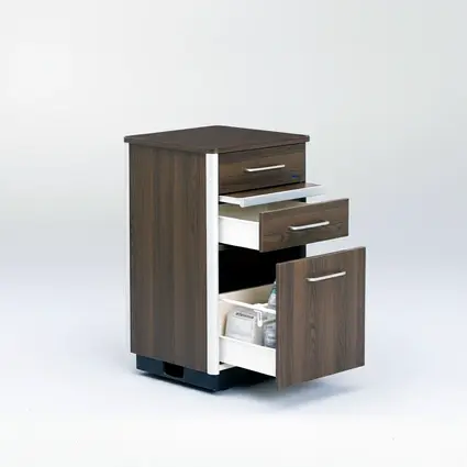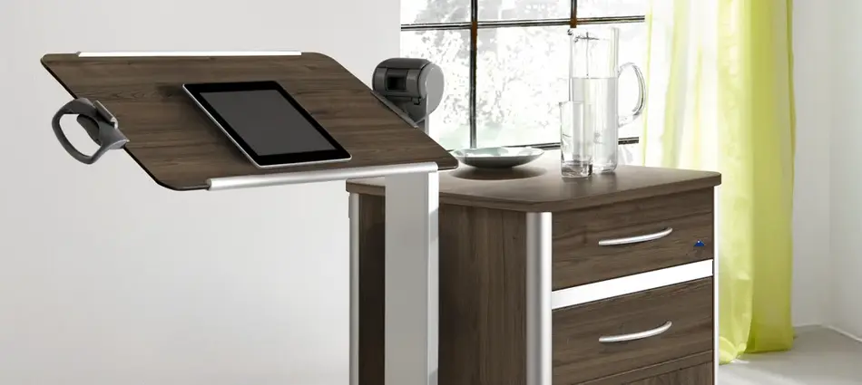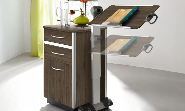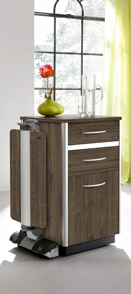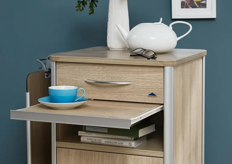 Les modèles Combino sont disponibles avec et sans tablette de lit latérale. Le plateau pivotant de la tablette de lit est idéal comme desserte et pour servir de pupitre de lecture. Sur la grande variante, différents tiroirs peuvent être disposés de manière individuelle. En option, un réfrigérateur peut également