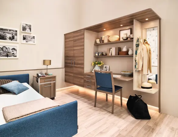 Notre système d’armoire Adrano présente une conception si flexible et compacte qu'il peut être adapté aux différents souhaits d'aménagements et aux situations grâce à de nombreuses options. Il est synonyme d'une atmosphère élégante et cosy, comparable à celle d'un bon hôtel. Les meubles sont également pratiques et sûrs. Les résidents peuvent ranger de manière optimale leurs vêtements et effets personnels et y ont toujours rapidement accès. Les chambres, les pièces à vivre, les bureaux ou encore les réfectoires bénéficient d'un charme incomparable grâce aux meubles Adrano.