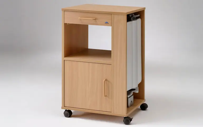 Het in hoogte verstelbare bedtafelblad van Arminius biedt bij het eten of lezen veel ruimte. Dankzij de dubbele wielen is het nachtkastje indien nodig goed te verplaatsen.