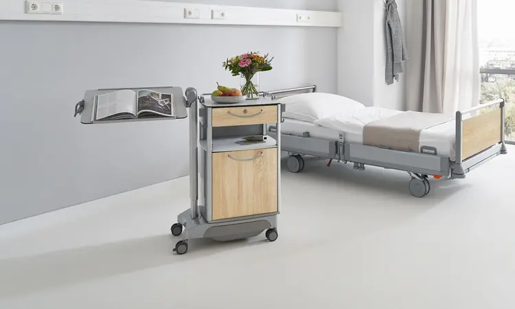 De Vitano biedt opbergruimte en een veilig bovenblad voor persoonlijke zaken en verzorgingsspulletjes. Het nachtkastje met ingebouwde koelkast of koelkastlade biedt speciaal comfort voor de patiënt.