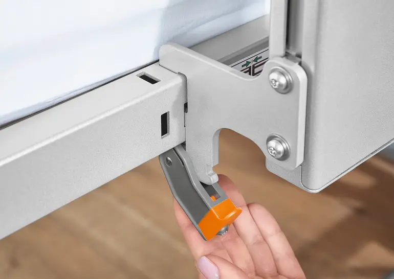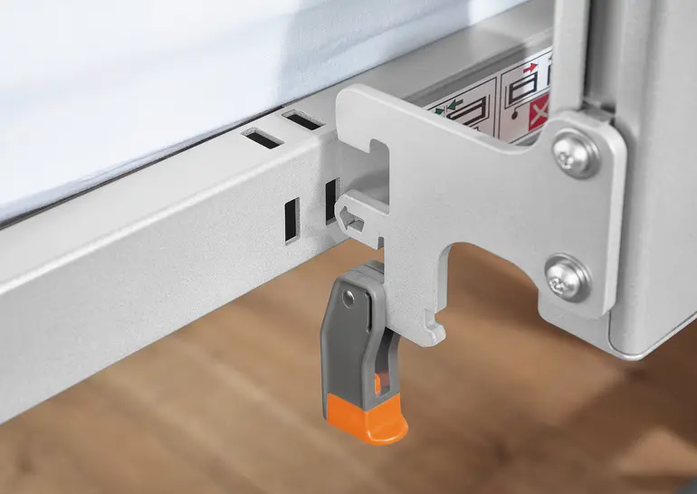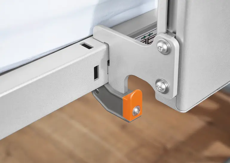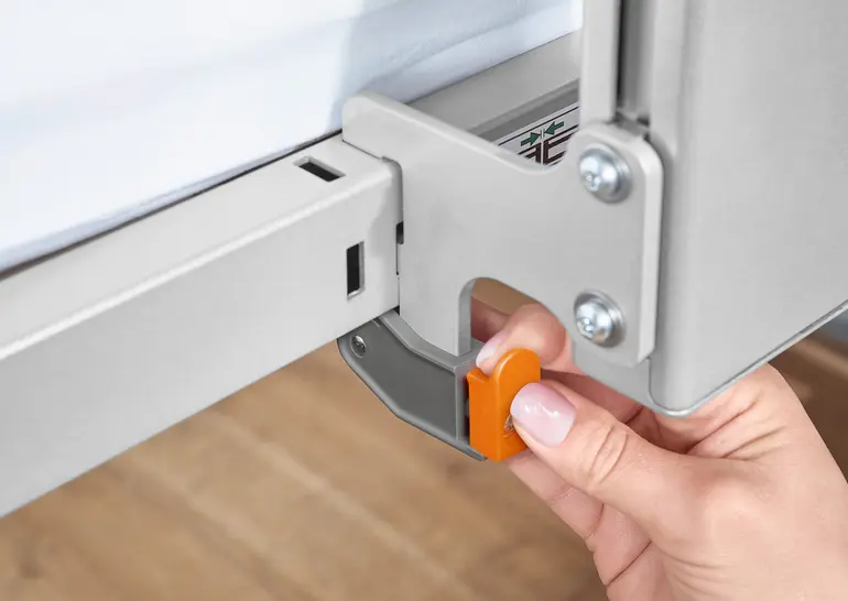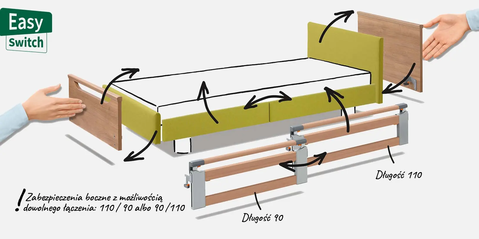 System Easy-Switch umożliwia bardzo łatwe uzupełnienie łóżka Regia w toku użytkowania w zabezpieczenia boczne o nowej estetyce odpowiedni do potrzeb użytkownika. Dzięki temu łóżko rozwija się wraz z potrzebami użytkowników i wspiera ich na każdym etapie ich życia. Zdejmowane zabezpieczenia boczne umożliwiają ponadto szybką przebudowę, zawsze odpowiednio do danej sytuacji w opiece. Dodatkowo znacząco ułatwiają montaż łóżka.