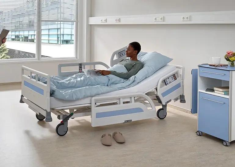 Ekonomiczny łóżko Evario one jest idealne do zastosowania w pokojach wieloosobowych. Dobra manewrowość jest tam bardzo ważna, gdyż pozwala uniknąć kolizji i ułatwia pracę personelowi medycznemu. Nowoczesne koła Evario one 125 lub 150 mm pozwalają na precyzyjne manewrowanie łóżkiem. Opcjonalne 5. koło umożliwią kierowanie łóżkiem na wąskich zakrętach.