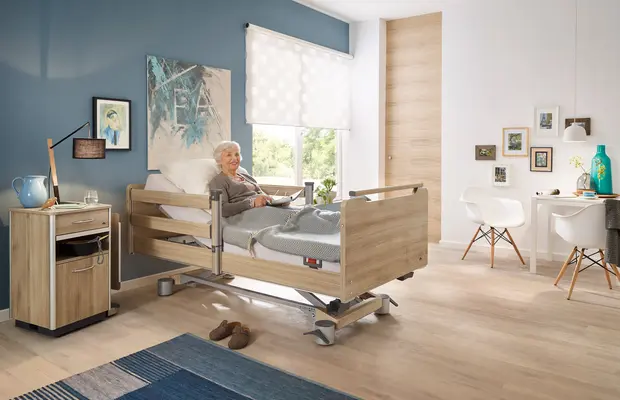 Nasze nowoczesne łóżka szpitalne i łóżka do opieki długoterminowej wspierają użytkowników 4--segmentowym, bezstopniowo regulowanym leżem. Poszczególne pozycje leża można bez trudu ustawić za pomocą pilota podręcznego lub panelu sterowania. W celu jak najlepszego wykorzystania tej zalety polecamy wysokiej klasy materace, które są precyzyjnie dopasowane do naszych łóżek.