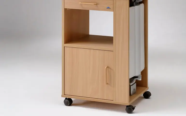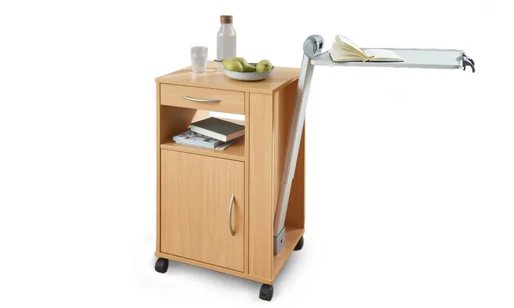 The height-adjustable tabletop of the Arminius is spacious enough to use for meals or reading. With its large double castors, the bedside cabinet ensures good manoeuvrability when required.