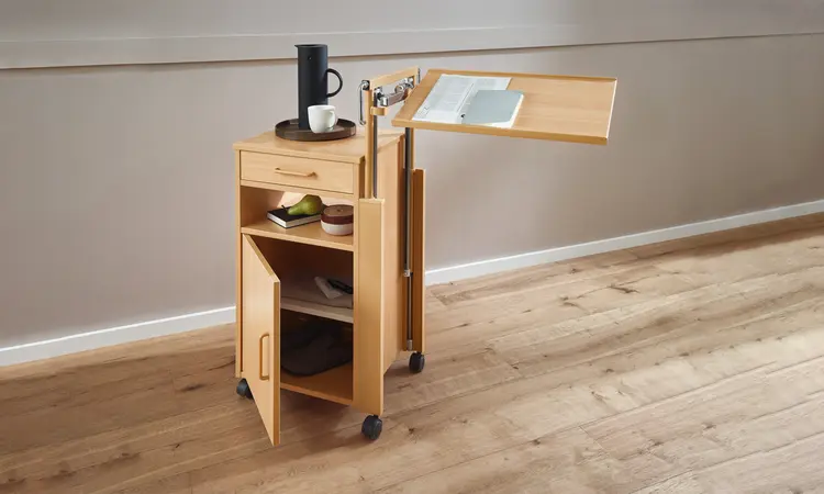 The large wood-decor overbed table has a tilting top and its height can be adjusted. This makes it ideal for mealtimes and reading. The bedside cabinet is easy to manoeuvre.