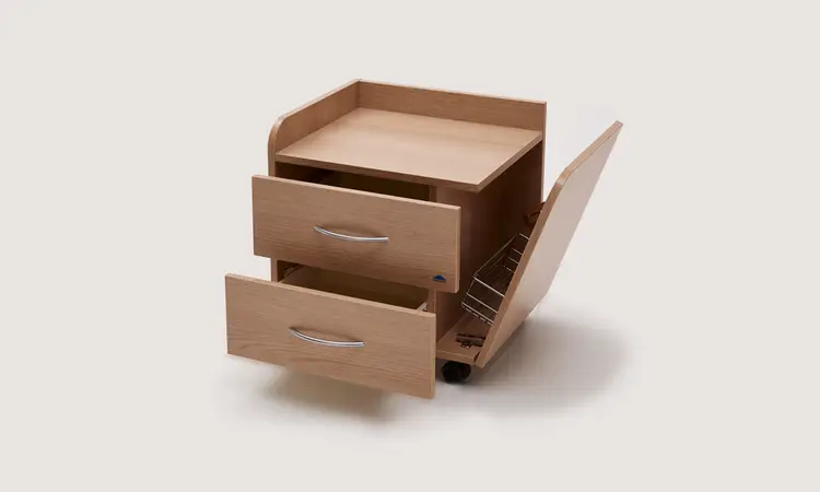 The tabletop of the Varus is so cleverly incorporated in the cabinet body that bottles and glasses are prevented from falling off at the sides. This bedside cabinet is available in Natural Beech, Royal Maple, Havana Cherry and Bella Noce decors.