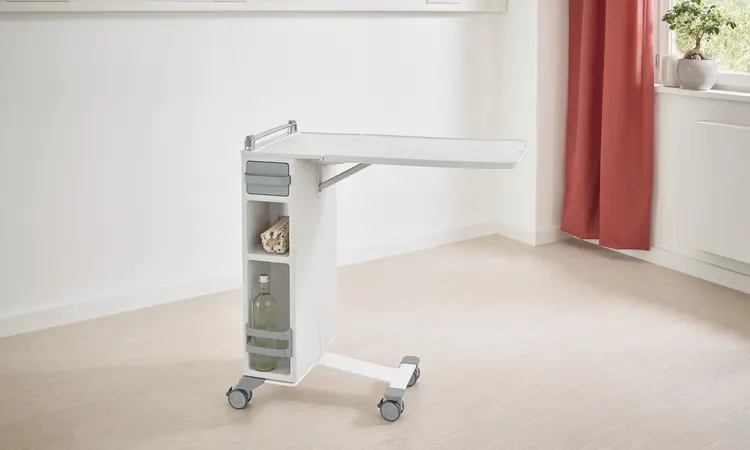 The Quado server is a real space miracle. With its functions reduced to the essentials, it is ideal for everyday care situations. Two open compartments on both sides and a drawer that can be opened from either side provide ample storage space. Thanks to its good manoeuvrability, it can be used as a trolley for care utensils or medicines.