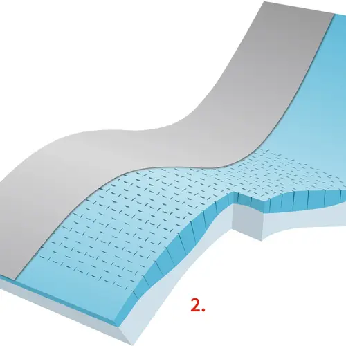 The base layer of the soft-therm mattress incorporates a fine grid of perforations according to the Rhombo-flex® process. These are fine circular incisions which are partly hollow and partly still filled with cold foam. Only the edges of the mattress remain untreated to ensure greater stability when standing up and sitting down.